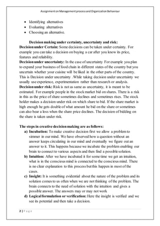 2) The decision making process and types of decisions made under certainty, uncertainty, and risk.