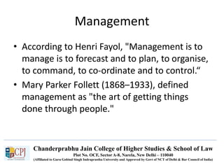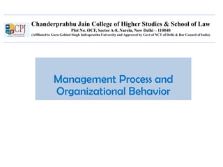 The document discusses the fundamentals of management and organizational behavior at Chanderprabhu Jain College, covering definitions, significance, and core processes of management. It highlights key functions including planning, organizing, staffing, leading, and controlling, along with theories of motivation and management roles. The document also emphasizes the importance of coordination and delegation in effective management practices.