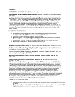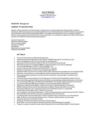 Lee A. Quarles is an aviation professional with over 24 years of experience in aircraft operations and management, excelling in leadership roles and project management for multi-million dollar aviation projects. He has a strong background in maintenance and production management, with a proven record of optimizing aircraft availability and reducing costs. Quarles holds a Bachelor of Science in Business Administration, has received numerous commendations, and has successfully managed various aircraft maintenance programs throughout his career.