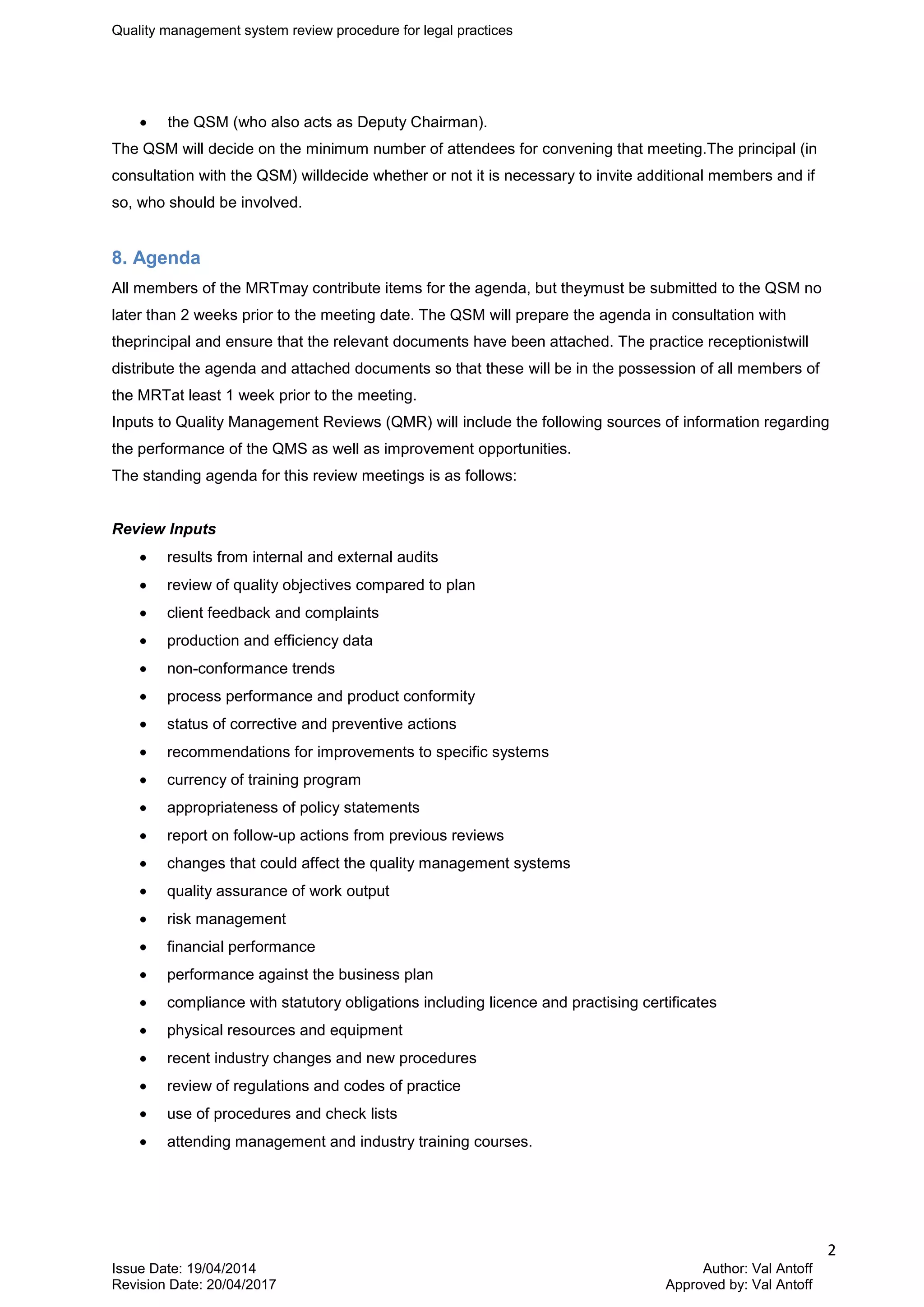 This document outlines the quality management system review procedure for legal practices, detailing the purpose, scope, and responsibilities involved in the management review process. It emphasizes regular assessment of the quality management system (QMS), identifying areas for improvement, and ensuring compliance with the Law 9000 standard. Management review meetings occur biannually, focusing on evaluation, corrective actions, and communication of outcomes to all relevant staff.