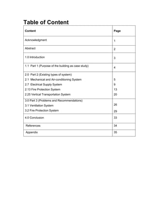 This document contains information about a school project on analyzing different building systems in a case study building. It includes sections on mechanical, electrical, fire protection, and vertical transportation systems. It discusses existing system types and identifies problems and recommendations. The document contains content, introduction, conclusions, references and appendix sections. It also lists the names of students involved in the project.