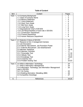 This document provides information about SEVEN, a new property development company in Malaysia. It includes the company's background, mission, vision, goals, organizational chart, and job descriptions for roles in the construction, finance, and human resources departments. The company was founded in 2017 by 7 partners and focuses on sustainable development. Goals include training employees, increasing quality, expanding locally and internationally, and maintaining the company's reputation. The organizational chart shows the general manager oversees 3 departments. Job responsibilities are outlined for roles in each department including project manager, architect, and accountant.