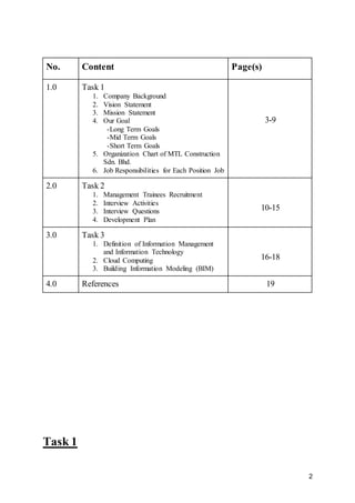 This document provides information about MTL Construction Sdn. Bhd., including its vision, mission, goals, organizational structure, and job responsibilities. It discusses recruiting 3 management trainees: an accountant to handle financial tasks, prepare reports, and ensure financial security; a site supervisor to oversee the site and employees, manage subcontractors, meet budgets, and ensure schedule and operational standards; and a project engineer to solve technical issues and monitor construction progress. MTL Construction aims to hire qualified candidates with the needed experience and skills to fill these roles.