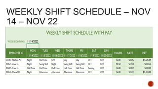 This document provides guidance on staffing a food truck. It recommends that most food trucks can hold between 2 to 6 workers, while most operations staff between 2 to 7 employees. It describes the roles and responsibilities of front-of-house staff who interact with customers, and back-of-house staff who handle tasks like cooking, cleaning, and bookkeeping. Some common food truck staffing roles include managers, service window attendants, chef/cooks, and kitchen workers. The document also includes tips on creating an organizational chart and shift schedule to plan staffing needs.