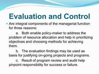 Evaluation and control are integral to management. Evaluation assesses results, outputs, quality, impact and effectiveness. It can be performance or program evaluation. Control ensures tasks are done efficiently to achieve objectives. The control process establishes standards, measures work, and takes corrective action. There are various instruments for employee evaluation like rating scales, ranking, and forced distribution. Program evaluation determines if a program achieves its goals using measures like cost-benefit analysis and cost-effectiveness. Communication is also important for organizations to coordinate work and integrate units.