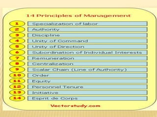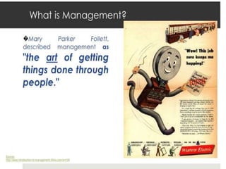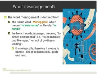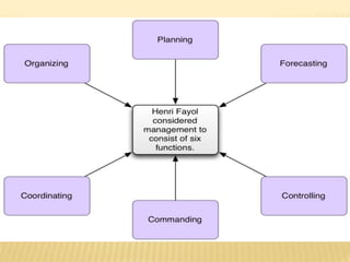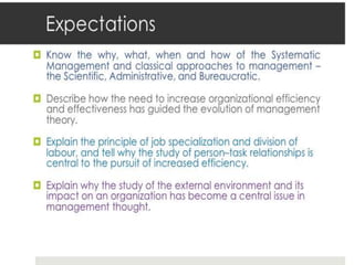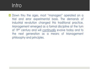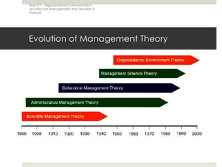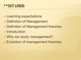 This document outlines the evolution of management theories from classical to modern approaches. It begins by defining management and management theories. The classical approaches are then described, including scientific management pioneered by Taylor which focused on efficiency. Administrative theories by Fayol and Weber emphasized formal structure. The behavioral school emerged next, exemplified by Mayo who stressed the importance of human relationships. Maslow's hierarchy of needs also influenced this period. Later, quantitative and contingency approaches analyzed organizational problems using mathematical and statistical methods to improve decision making. Modern theories strive for a balanced focus on both technical and human aspects of management.
