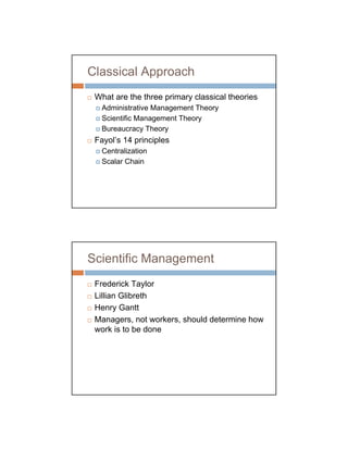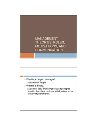 This document discusses various management theories including classical, scientific, and systems approaches. It covers managerial roles, leadership principles, and motivation theories. The classical approach includes administrative management theory, scientific management theory, and bureaucracy theory. Scientific management focused on determining the most efficient ways to perform tasks. The systems approach views an organization like an airport as made up of interconnected parts that cannot be optimized in isolation. Leadership principles discuss the differences between managers and leaders and various leadership styles and situational approaches. Motivation theories include content theories that emphasize fulfilling underlying needs.