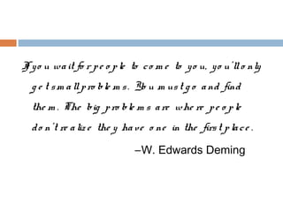 The document discusses the management technique of Management by Walking Around (MBWA). It involves managers spending time visiting employee work areas, listening to employees, and informally addressing issues. The goals are to identify problems, encourage communication, and strengthen relationships. It originated in the 1970s when Bill Hewlett and Dave Packard created a style of personal involvement and recognition. While some question its relevance today, proponents argue it remains an effective way to understand operations and motivate staff. Guidelines include visiting often without criticism and focusing on positive interactions.