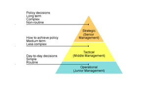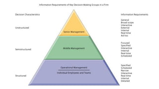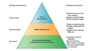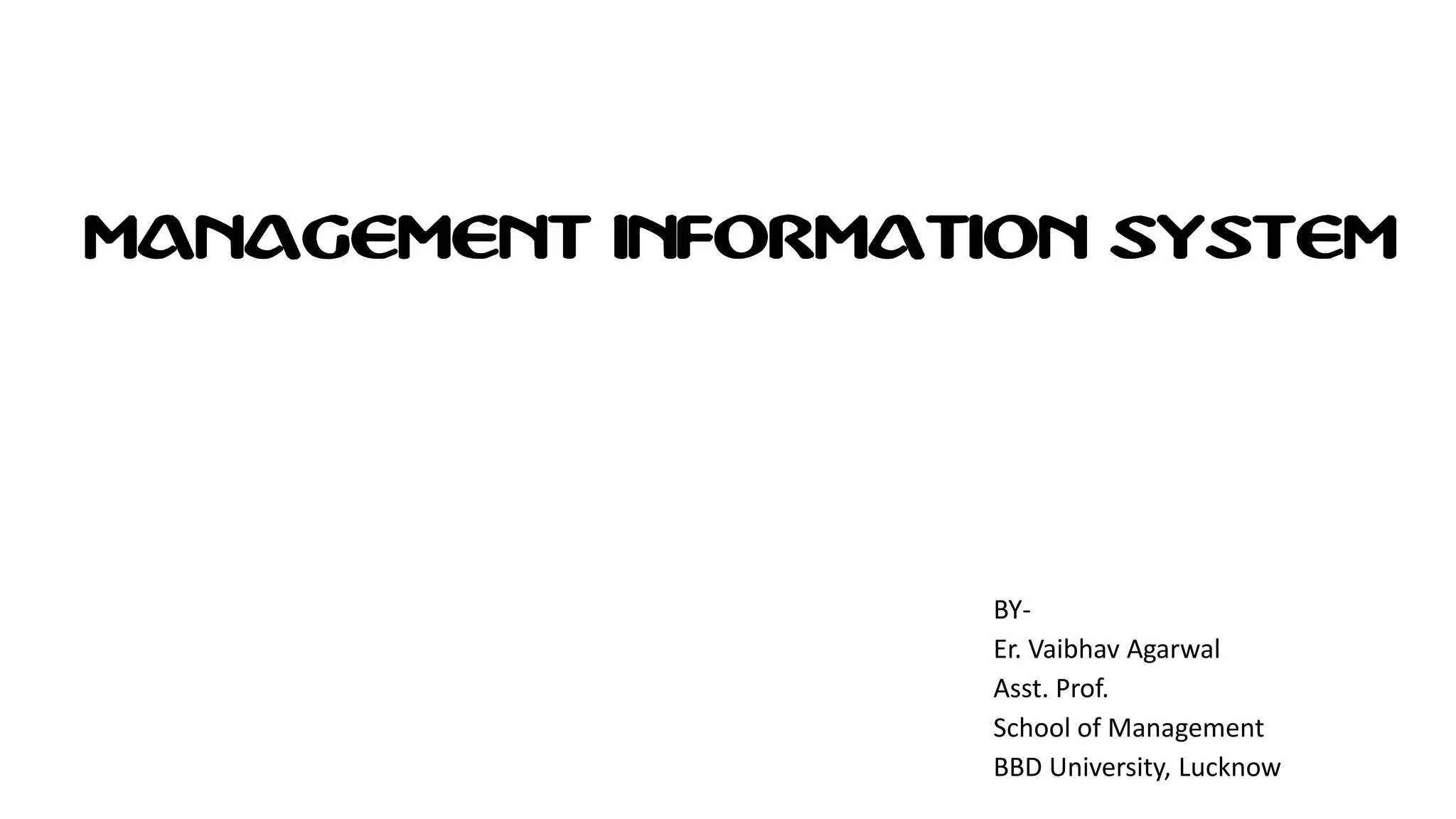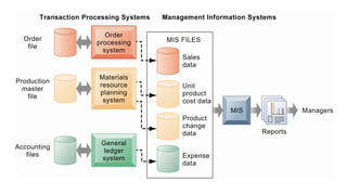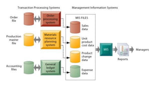 Management Information System (MIS) collects, processes, stores, and disseminates data to support decision making and coordination across various departments of an organization. MIS provides accurate and relevant information to managers at different levels. It helps in decision making, coordination, problem identification, and performance comparison. The main goal of MIS is to inform management and help them make better decisions to effectively run the business. It has benefits such as improved efficiency, expedited problem solving, enhanced communication and control, and competitive advantage.