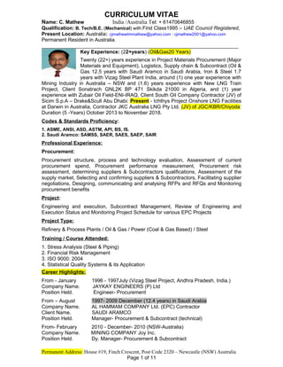 This document is a curriculum vitae for C. Mathew that summarizes his qualifications and over 22 years of experience in project materials procurement, logistics, and supply chain management for oil and gas, mining, and other industries. He holds a B.Tech/B.E. in Mechanical Engineering and has worked on various engineering, procurement, and construction projects around the world, including in Saudi Arabia, Australia, Algeria, and Iraq. His roles have included manager-level positions focused on procurement, subcontract management, and project execution.