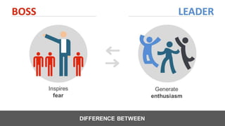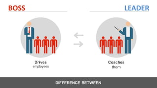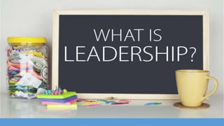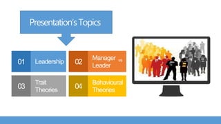 Leadership theories include trait theories and behavioral theories. Trait theories compare the innate qualities of leaders versus non-leaders, while behavioral theories focus on the specific actions of a leader and how their behaviors influence their leadership. The document also discusses the difference between a manager and a leader, with managers being responsible for overseeing others in a business, while leaders make decisions and inspire people to follow them.