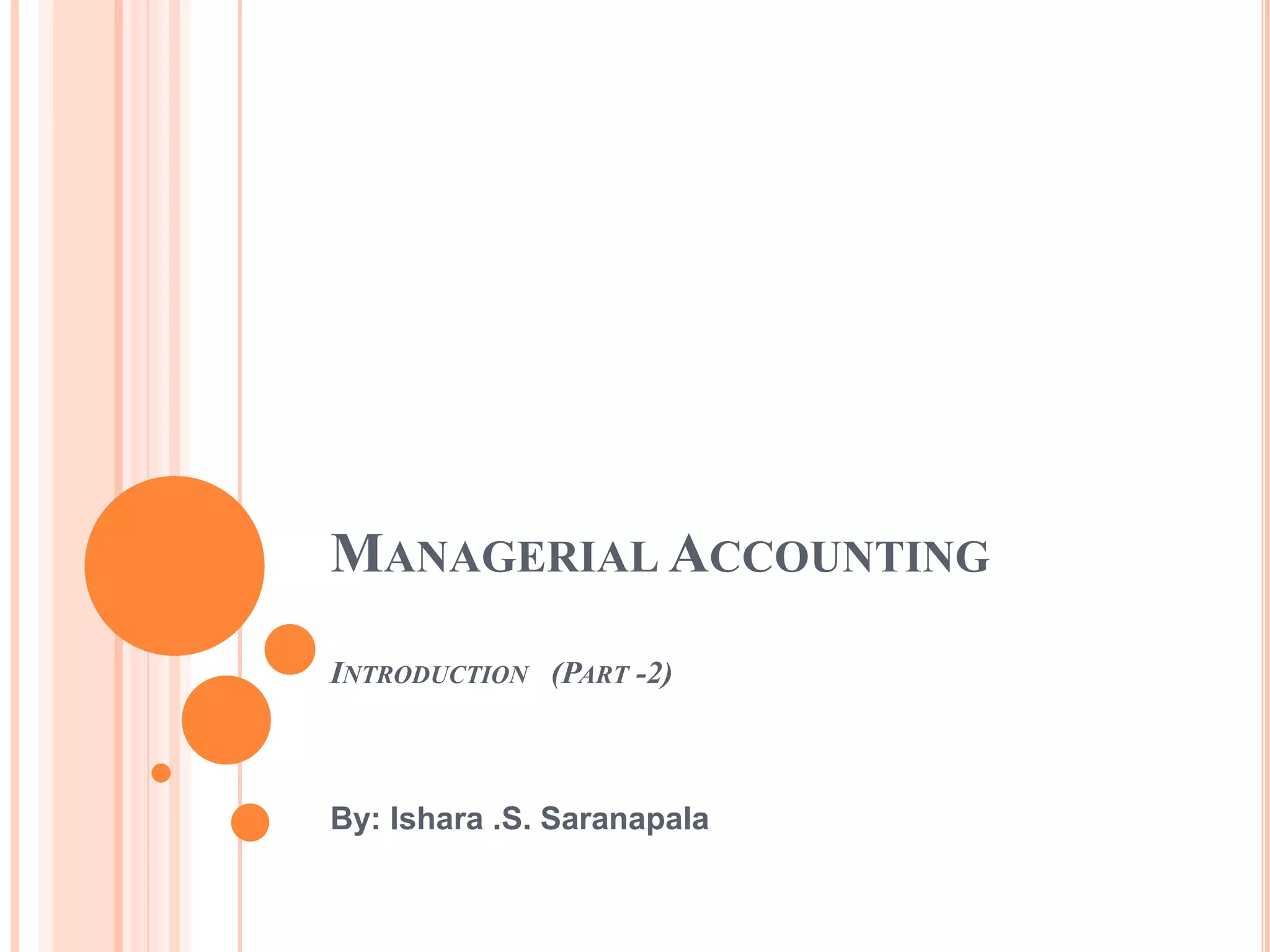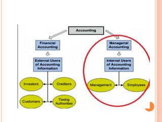 Managerial accounting involves identifying, measuring, analyzing, interpreting, and communicating financial and non-financial information to help an organization achieve its goals. It provides information to managers within an organization to help with planning, operating, and controlling decisions. Managerial accounting focuses on providing internal reporting, cost allocation, planning and control, and performance measurement to assist management decision making. It differs from financial accounting in that it provides internal reporting, focuses on specific areas and future planning rather than external reporting of past financial performance. Managerial accounting uses both monetary and non-monetary information to aid decisions, while financial accounting focuses on monetary reporting and the organization as a whole.