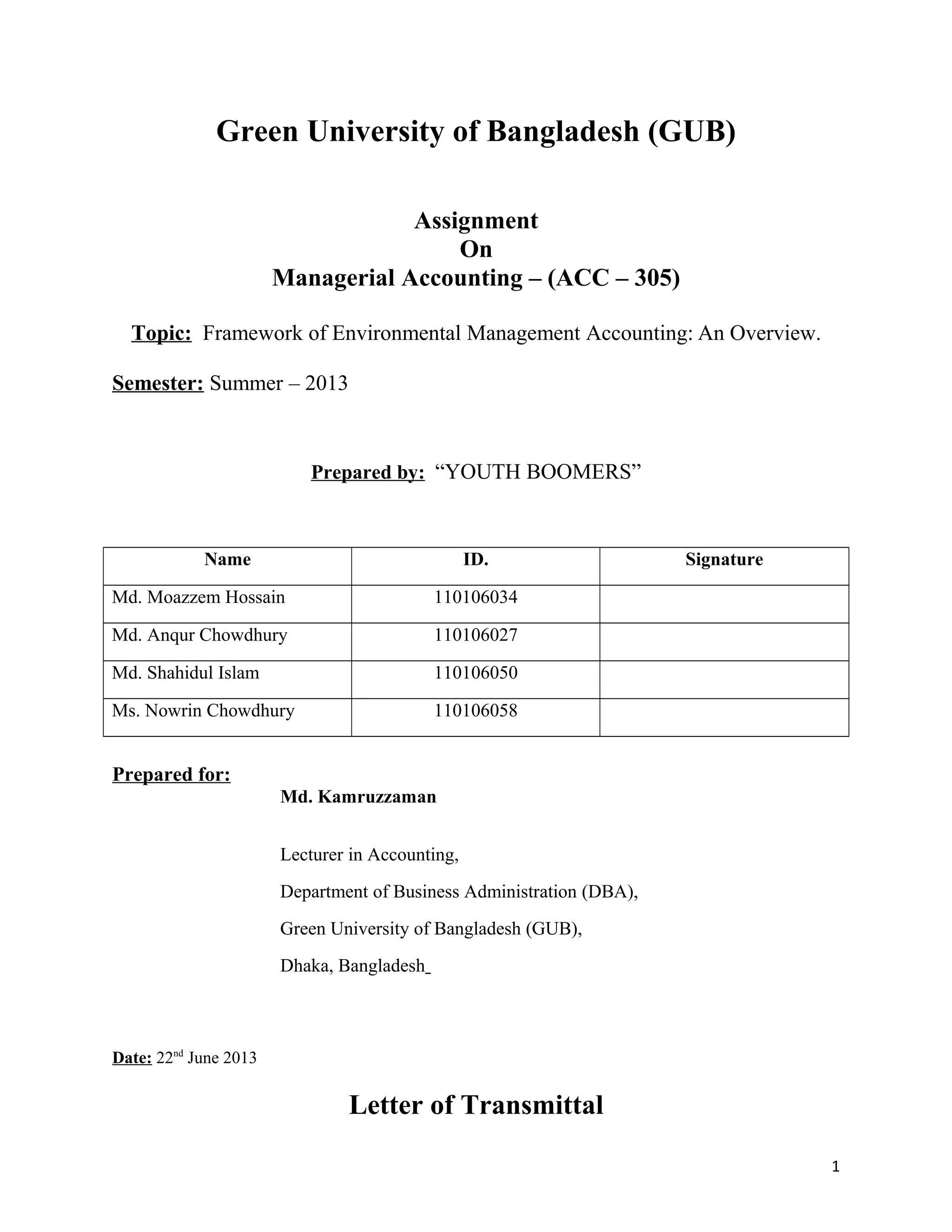 This document is an assignment submitted by a group of students at Green University of Bangladesh on the topic of environmental management accounting. It contains an introduction outlining the objectives and research methodology. The main body defines environmental management accounting, discusses why companies should care about the environment and the uses and benefits of EMA. It also outlines the key approaches and techniques of environmental management accounting frameworks, including input/output analysis, process flow charts, and activity-based costing. The conclusion states that clearly defining environmental costs is important for increased use of EMA.