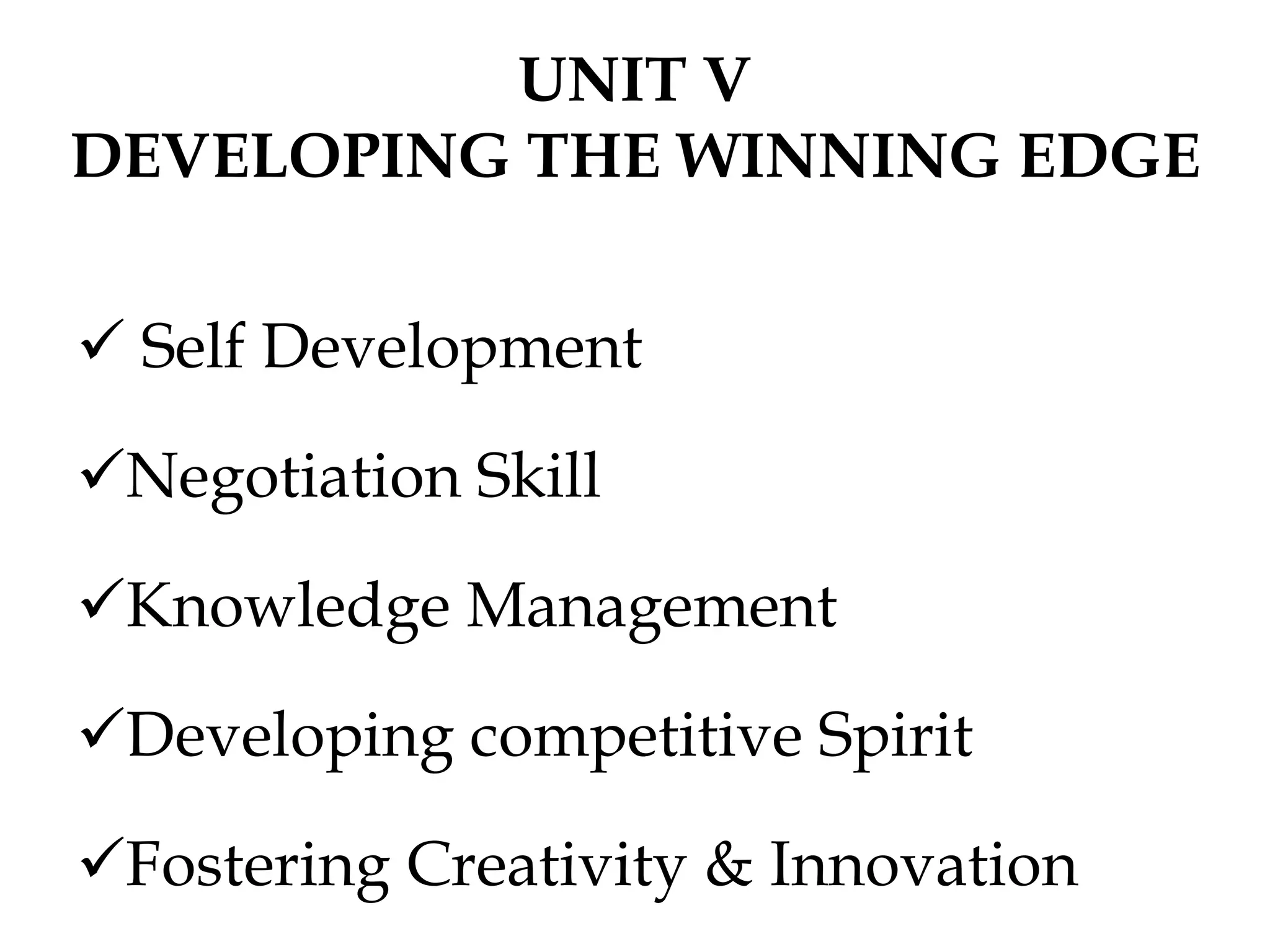 This document discusses various topics related to developing a competitive edge, including negotiation skills, knowledge management, creativity, and innovation. It provides information on negotiation processes and strategies, the components and drivers of knowledge management, and methods for fostering creativity such as brainstorming, mind mapping, and heuristics. The document also differentiates between types of innovation and lists factors that can influence innovation and creativity within an organization.