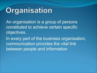Organizational communication involves the flow of information within a company through both formal and informal channels. Formal communication includes downward communication from managers to employees, as well as upward communication from employees to managers. Informal communication occurs through the grapevine, which spreads rumors and information quickly but can distort or exaggerate details. Effective organizational communication requires understanding different communication styles, providing clear and timely information to address issues, and utilizing both formal and informal channels to supplement each other.