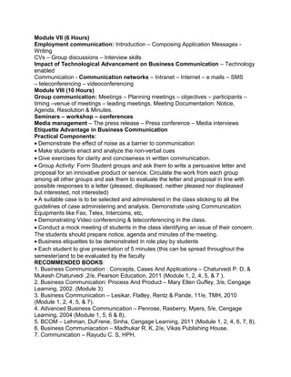 This document outlines the modules and content covered in a course on managerial communication. The 8 modules cover topics such as communication processes, oral and written communication skills, business letters and reports, case study analysis, presentation skills, employment communication, group communication, and media management. Practical components include demonstrations of communication barriers, non-verbal cues, writing exercises, case study administration, and student presentations. Recommended textbooks are provided to support the various module topics.