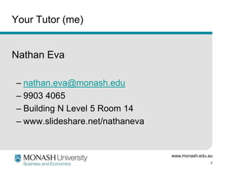 This document provides information for students in the MGF1100: Managerial Communication course at Monash University. It outlines contact details for the tutor, Nathan Eva, and details on three assignments. It also discusses emotional intelligence assessments, the Johari Window model of self-awareness, and strategies for effective communication and improving trust within work teams. Students are instructed to complete exercises applying the Johari Window to themselves and in groups, and to consider ways to strengthen their communication and openness based on what they have learned.