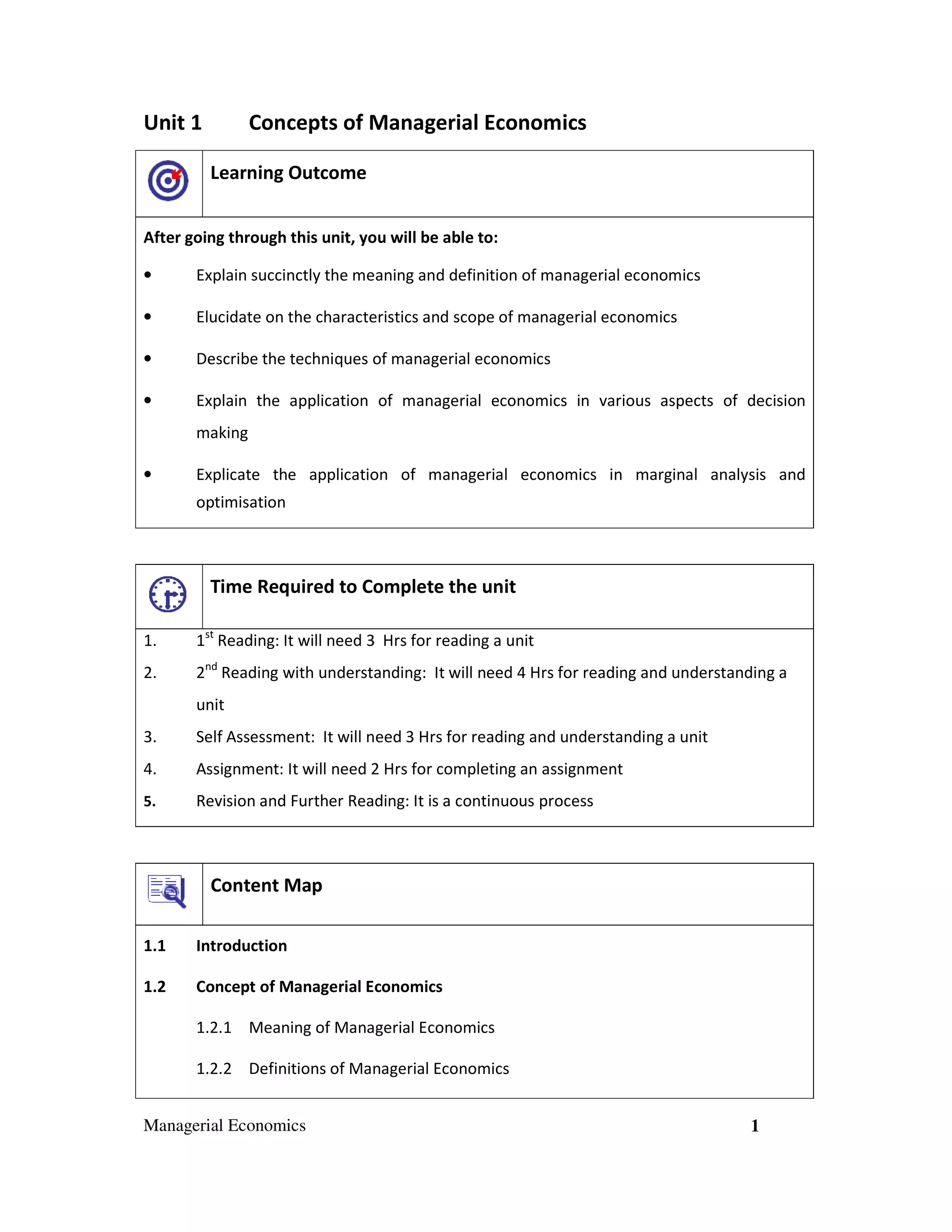 This document provides an overview of concepts covered in a unit on managerial economics. It defines managerial economics and explains its key characteristics and scope. The unit aims to help students understand managerial economics and apply its techniques to decision making. It will take approximately 12 hours to complete, including time to read the material, do a self-assessment, and complete an assignment. The content is organized into sections covering topics like the concepts, techniques, and applications of managerial economics.