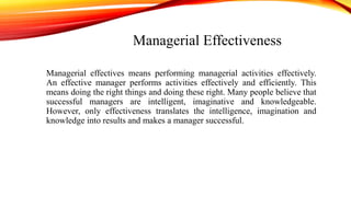 This document discusses managerial effectiveness and interpersonal skills. It defines managerial effectiveness as performing managerial activities effectively and efficiently. An effective manager has qualities like basic knowledge, skills, creativity and self-awareness. Effective managers focus on their contribution, build on strengths, concentrate on one task at a time and make systematic decisions. Interpersonal skills are crucial for managers to communicate, motivate teams and develop relationships both internally and externally. Transactional analysis is a technique to understand behavior and relationships through analyzing ego states, transactions, scripts, games and life positions. Managers need to develop interpersonal skills like active listening, empathy and resolving conflicts.