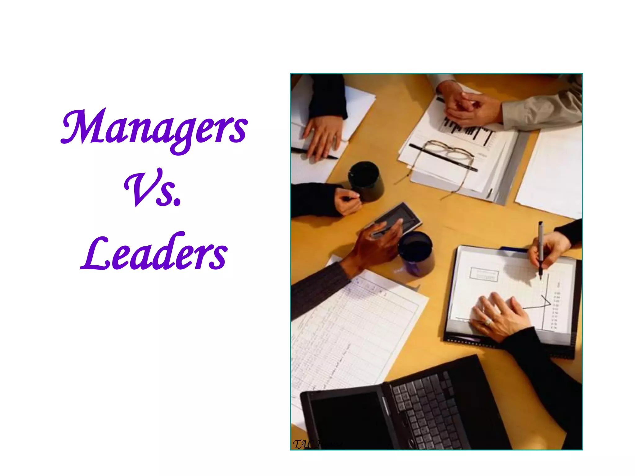 The document contrasts the roles and behaviors of managers versus leaders. It outlines that managers focus on short-term results, maintaining standards, and controlling others through positional power. Leaders take a longer term visioning approach, develop others through coaching, and gain commitment and inspire confidence through personal influence. Overall, the document suggests that managers tell others what to do, while leaders show others how to do it.