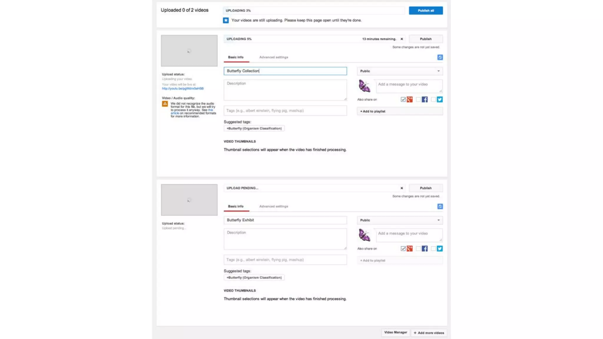 Supported video formats for YouTube uploads and options for setting privacy levels.