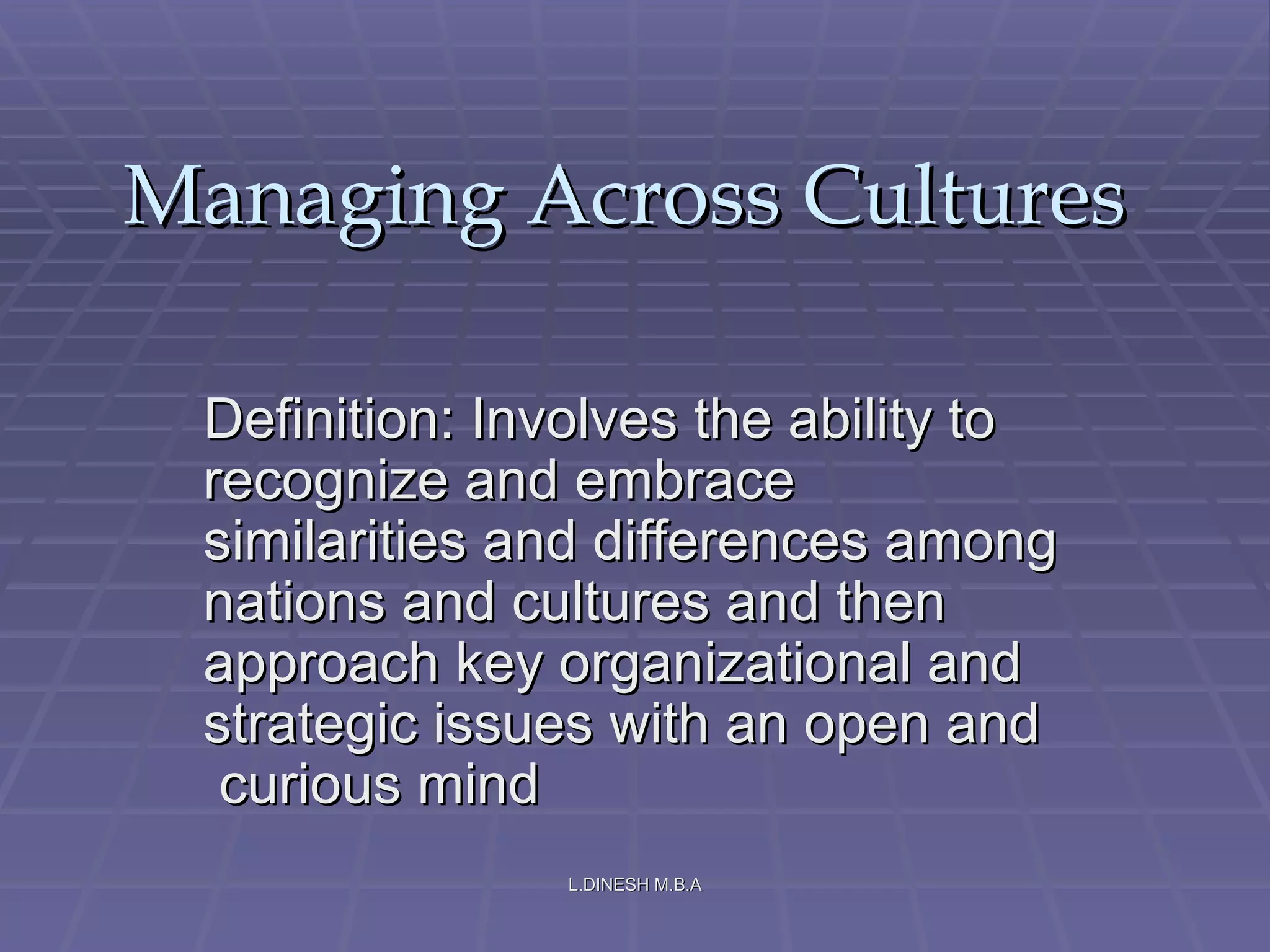 Managing across cultures involves recognizing similarities and differences between nations and approaching issues with an open mind. Cultural values are deeply held beliefs that specify preferences and define right and wrong. Organizational culture starts when key people share a common vision and collaborate to create an organization. Managing across cultures requires understanding cultural factors to motivate employees and having a strong culture that reduces turnover. Multinational strategies must address cultural similarities and differences in varied markets.