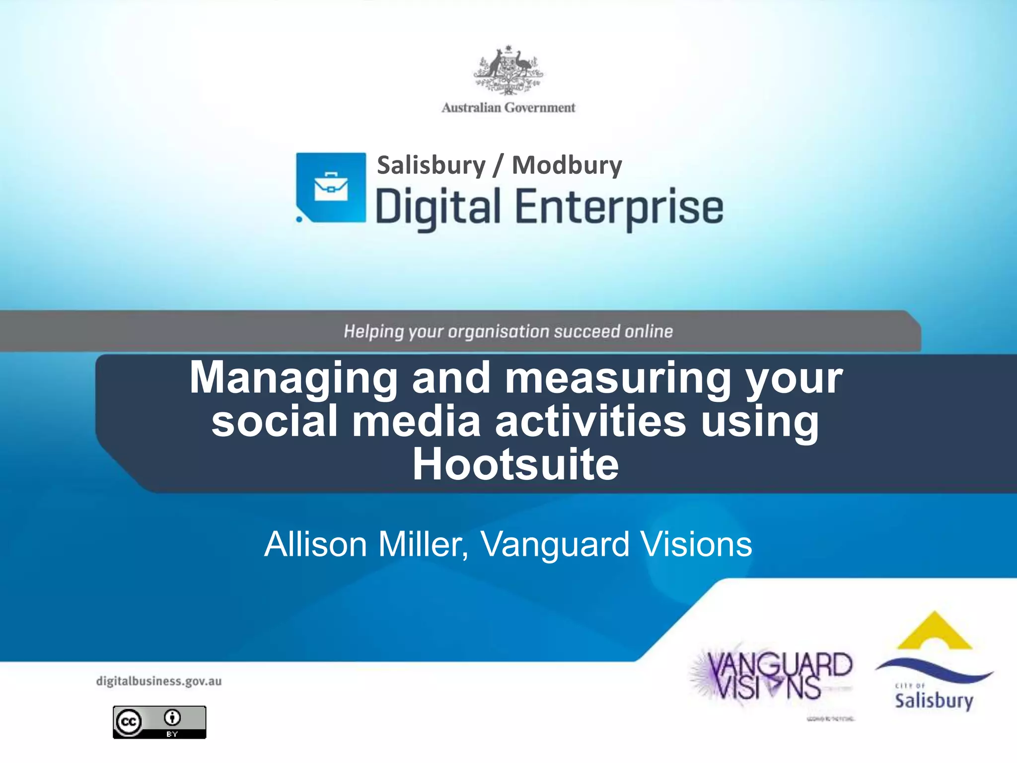 This document outlines a presentation about using Hootsuite to manage social media activities. It discusses why businesses use social media and which platforms are popular in Australia. It then introduces Hootsuite as a tool to schedule and monitor posts across multiple social media profiles. The presentation provides tips for creating a Hootsuite strategy, including understanding goals and competitors, and measuring the results. Attendees are invited to consider what aspects they want to investigate further.