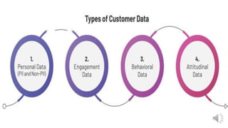 Customer data includes personal information, engagement data, behavioral data, and attitudinal data that businesses collect from customers through their interactions and transactions. This data can be collected through various channels like websites, mobile apps, social media, emails, surveys, customer service software, and transaction records. It is important for businesses to properly manage customer data by keeping it secure, collecting it ethically, using it to generate insights and build better customer experiences and communications.