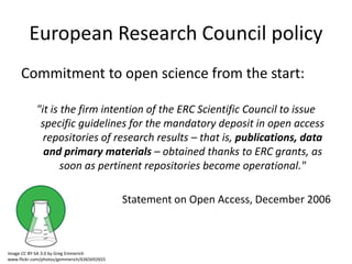 The document discusses the importance of managing and sharing research data, highlighting a commitment to open science by the European Research Council. It outlines benefits such as increased citations and institutional returns from shared data, while also addressing barriers like data ownership and sharing restrictions. Additionally, it emphasizes the need for improved systems and training for researchers to develop good practices in data management and sharing.