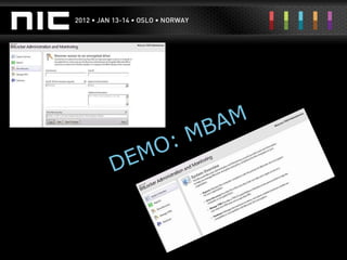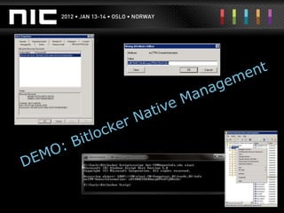 This document provides an overview of managing Bitlocker encryption with Microsoft Desktop Optimization Pack (MDOP). It discusses using Bitlocker encryption to encrypt drives on devices and the benefits of using disk encryption. It then compares managing Bitlocker without using Microsoft Bitlocker Administration and Monitoring (MBAM) versus using MBAM. Managing Bitlocker without MBAM involves manual scripts and management with no reporting capabilities, while MBAM simplifies deployment, provides reporting on compliance and auditing, and reduces support costs through improved key recovery.