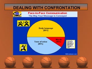 This document provides tips for officials on how to effectively communicate with coaches during a game. It advises officials to introduce themselves to coaches before the game, maintain a calm demeanor, make eye contact, answer questions briefly and factually, and avoid confrontation. Officials should listen without interrupting, be aware of their own body language, and address issues without getting defensive or escalating conflicts. When speaking to angry coaches, officials should ask them to lower their voice before responding respectfully. The overall goal is to achieve balance and closure in interactions rather than having winners or losers.