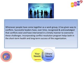 Managing Conflicts @ Workplace discusses how conflicts are an inevitable part of any workplace where people from different backgrounds and perspectives interact. It states that while fully eliminating conflicts may not be possible, establishing frameworks for addressing them can help create a more harmonious environment. The document outlines some common sources of conflicts at work, such as differing work habits, promotion opportunities, and job security issues. It claims that learning to properly identify and handle conflicts using different resolution strategies can help individuals better manage conflicts and foster a positive work culture. The training is recommended for anyone wanting to improve their conflict management skills, especially workplace leaders.