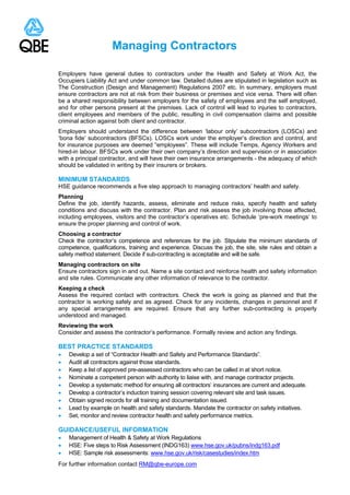 Employers have specific legal duties under the Health and Safety at Work Act and related legislation to ensure contractors are safe and do not pose risks to employees or the public. Proper contractor management involves planning, selecting competent contractors, on-site supervision, and performance review, including verifying insurance arrangements. Best practices include developing health and safety performance standards, conducting audits, and providing training for contractors.