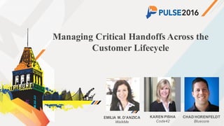 The document discusses managing critical handoffs across the customer lifecycle. It provides tips for effective transitions between customer success (CS) and sales teams. Key tips include ensuring clear goals, timelines, and roles in transition processes. It also emphasizes centralizing customer information in the CRM to avoid silos, and measuring results to ensure accountability. Effective tools can help drive smooth collaborations when information is accessible to both teams.