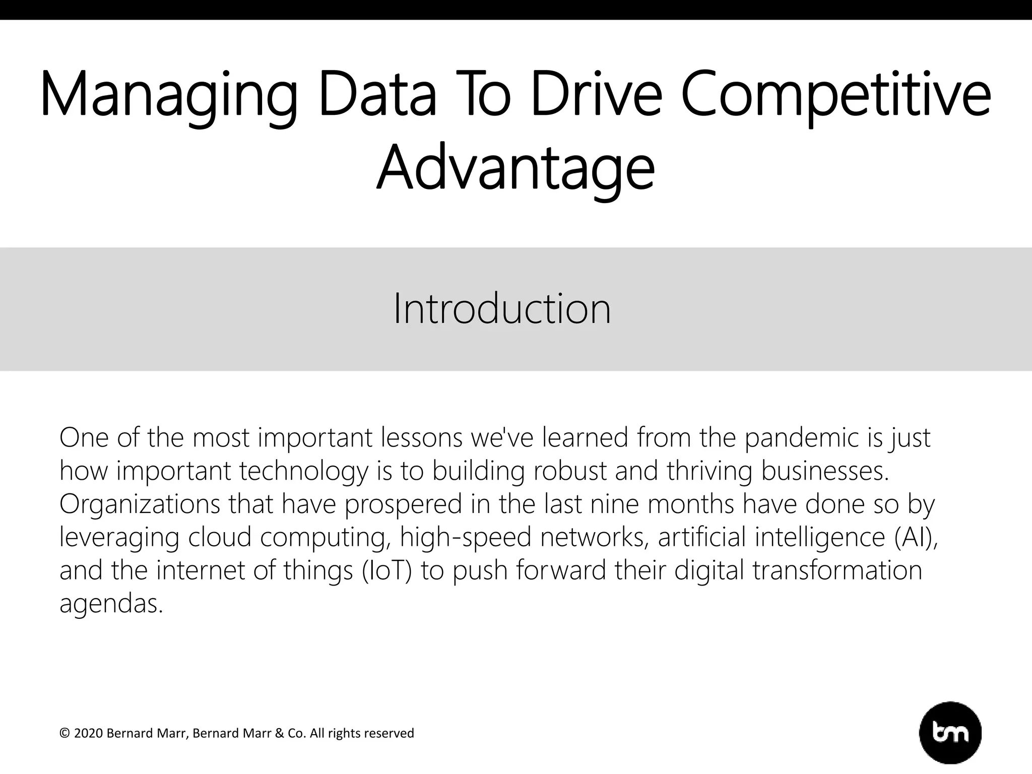 The document emphasizes the critical role of data and technology in driving business success, especially during the pandemic. It highlights how organizations must leverage data through advanced technologies like AI and cloud computing to gain competitive advantages and meet customer needs. Additionally, it outlines three core strategies for businesses to harness data effectively: making informed decisions, enhancing customer service, and improving internal processes.
