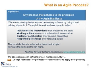The document focuses on managing distributed agile teams, outlining principles from the Agile Manifesto that emphasize customer satisfaction, adaptability, and collaboration. It discusses various agile methodologies, notably Scrum, and specifies best practices for ensuring effective communication and productivity in distributed team environments. Additionally, it provides case studies and recommendations for overcoming challenges associated with geographic distribution within agile frameworks.
