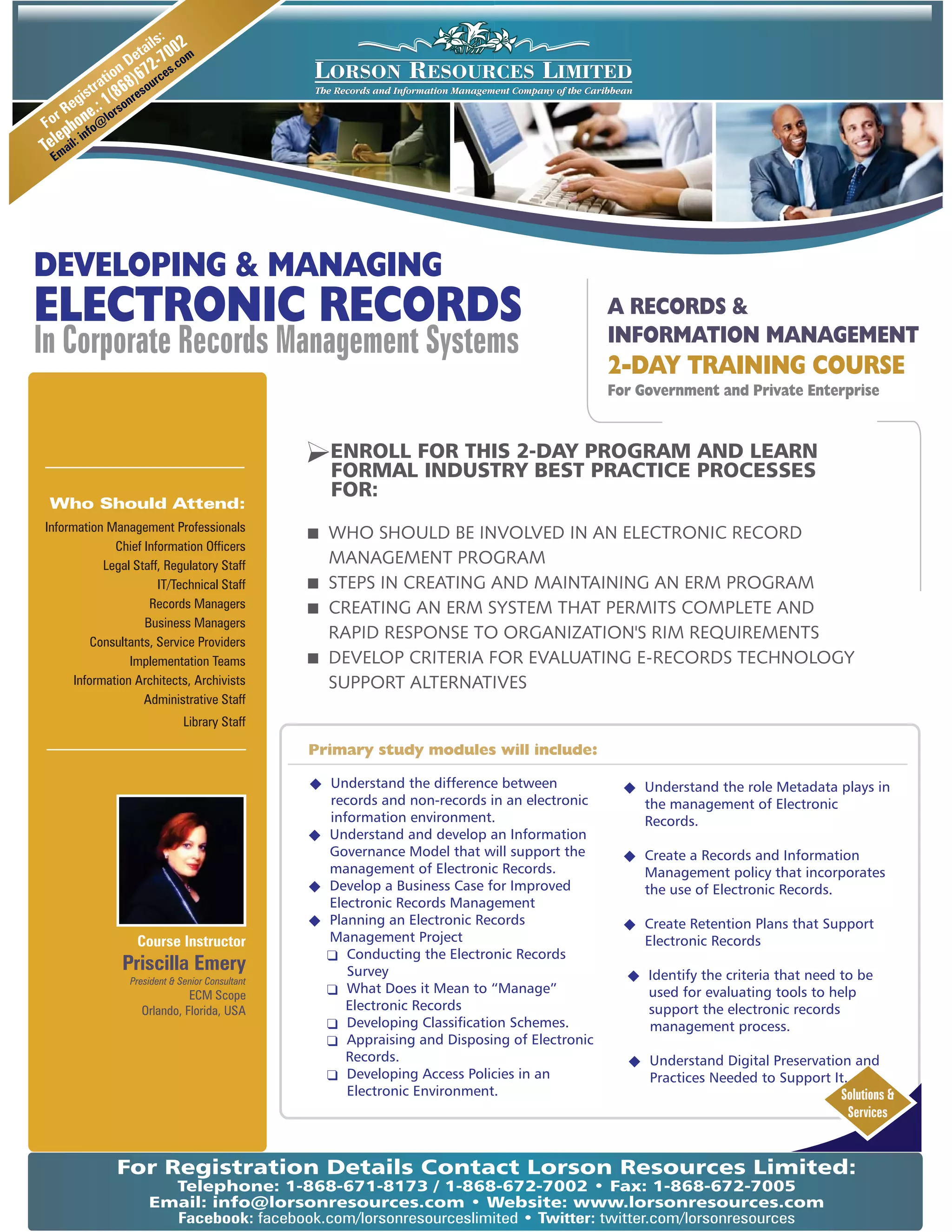 The document is a course description for a workshop titled 'Managing Electronic Records in RM Systems,' focusing on the development and management of electronic records in various organizations. It outlines the course objectives, topics covered, and the target audience, emphasizing the importance of systematic policies for effective records management. The course includes interactive discussions, presentations, and case studies and is aimed at information management professionals and organizational stakeholders.