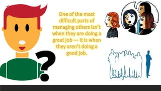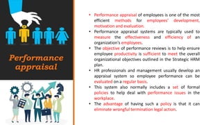 The document discusses various methods for employee performance appraisal, emphasizing their role in employee development, motivation, and evaluation. Key approaches include Management by Objectives (MBO), Behaviorally Anchored Rating Scales (BARS), and graphic rating scales, each with distinct advantages and disadvantages. It also outlines processes for addressing performance issues, emphasizing the importance of proper documentation and clear organizational policies.