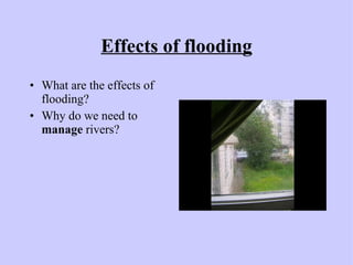 The document discusses different methods for managing floods to reduce their impact, including both hard and soft engineering techniques. Hard engineering techniques like dams, embankments, and flood walls aim to control rivers through complicated engineering structures, while soft engineering works with natural river processes using methods such as washlands, land-use zoning, and afforestation. The effectiveness and sustainability of management schemes depends on factors like the land value, number of affected people, costs, and how well the schemes control flooding over the long run.