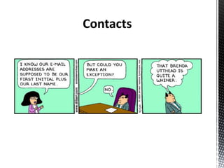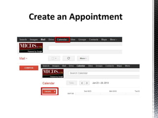 The document outlines features and functionalities of Gmail, including email organization through labels, contact management, and calendar appointments. It explains how to perform tasks like applying labels, moving messages, managing contacts, creating appointments with reminders, and handling documents in Google Drive. Additionally, it covers document sharing permissions and the capability for simultaneous editing.