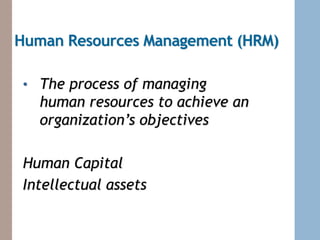 - Human resource management (HRM) involves acquiring, developing and maintaining the human resources of an organization to achieve its objectives. It applies management principles to all aspects of managing people, including recruitment, training, compensation and benefits, performance appraisal, and labor relations. The goal of HRM is to attract and retain talented employees to help the organization succeed.
