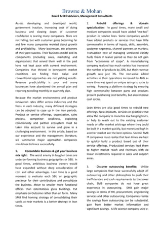 1) The document provides strategies for companies to adopt to cope with lean times, including consolidating business units, rebuilding offerings, discovering outsourcing benefits, investing in customer experience, reorganizing sales and support functions, focusing teams, and partnering.