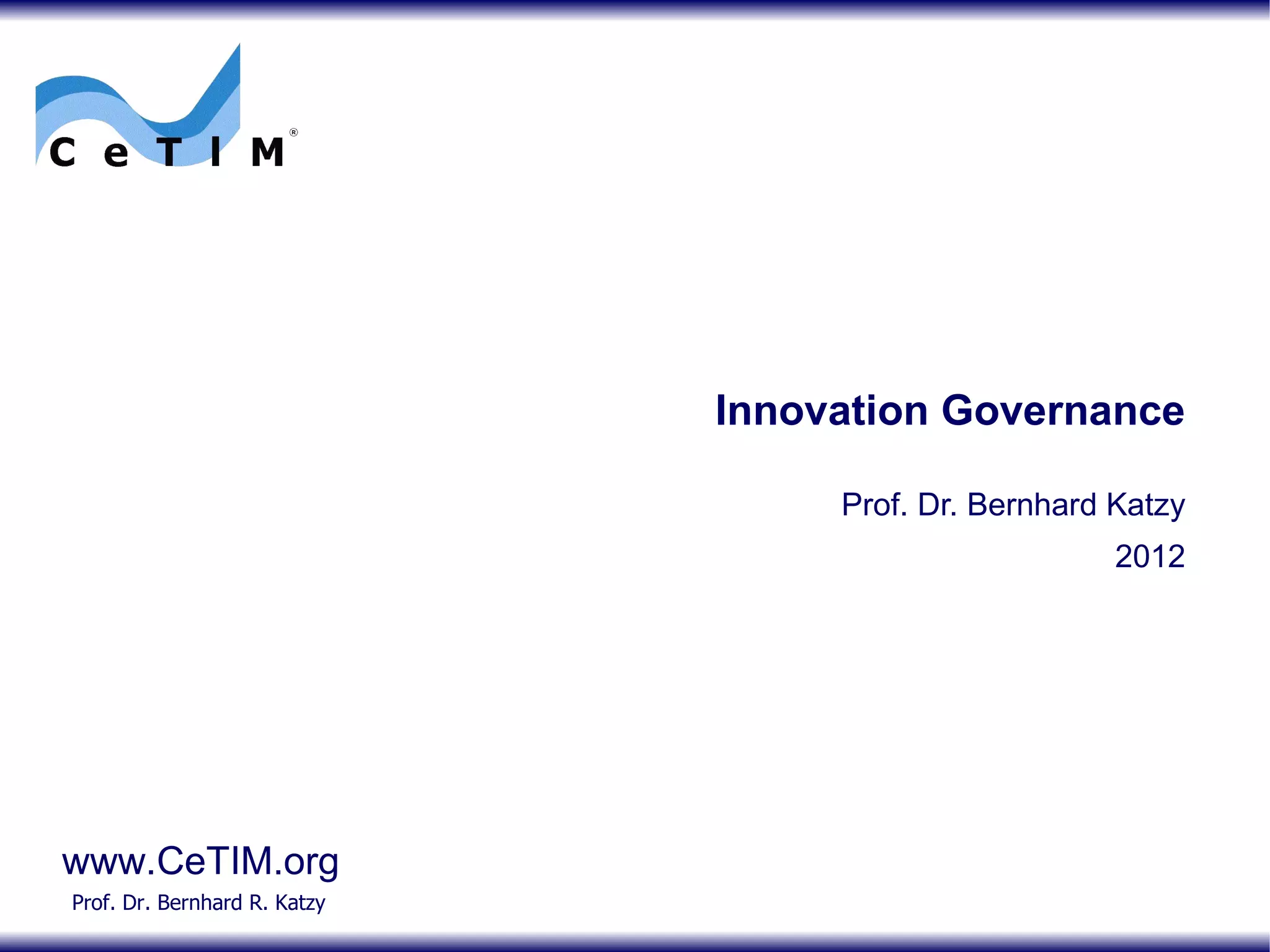 The document discusses innovation governance and three models: hierarchy/bureaucracy, new public management/market, and network. It presents examples of how governments have approached innovation funding and regulation using these different models. The text also examines a shift from government to multi-level governance and the case study of electronic health record innovation.