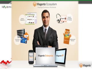 Magento's multi-store capabilities allow businesses to run multiple storefronts from a single Magento installation. This reduces costs and overhead compared to running separate sites. Key benefits include reusable catalog and customer data, centralized order management, and shared marketing and admin tools. The presentation provides examples of how Magento's architecture supports multi-site implementations and discusses additional partners that can help with hosting, tax compliance, and training.