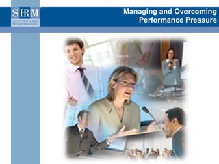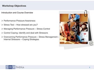 This document provides an overview and objectives for a workshop on managing and overcoming performance pressure. The workshop covers topics such as stress awareness, identifying stressors, managing performance pressure through stress control techniques, and overcoming performance pressure through stress management of internal and external stressors. Specific techniques taught include identifying personality types, signs of stress, causes of stress, relationship stressors, work stressors, and coping strategies to deal with anxiety, manage self-image and self-esteem, and reprogram negative thinking patterns.