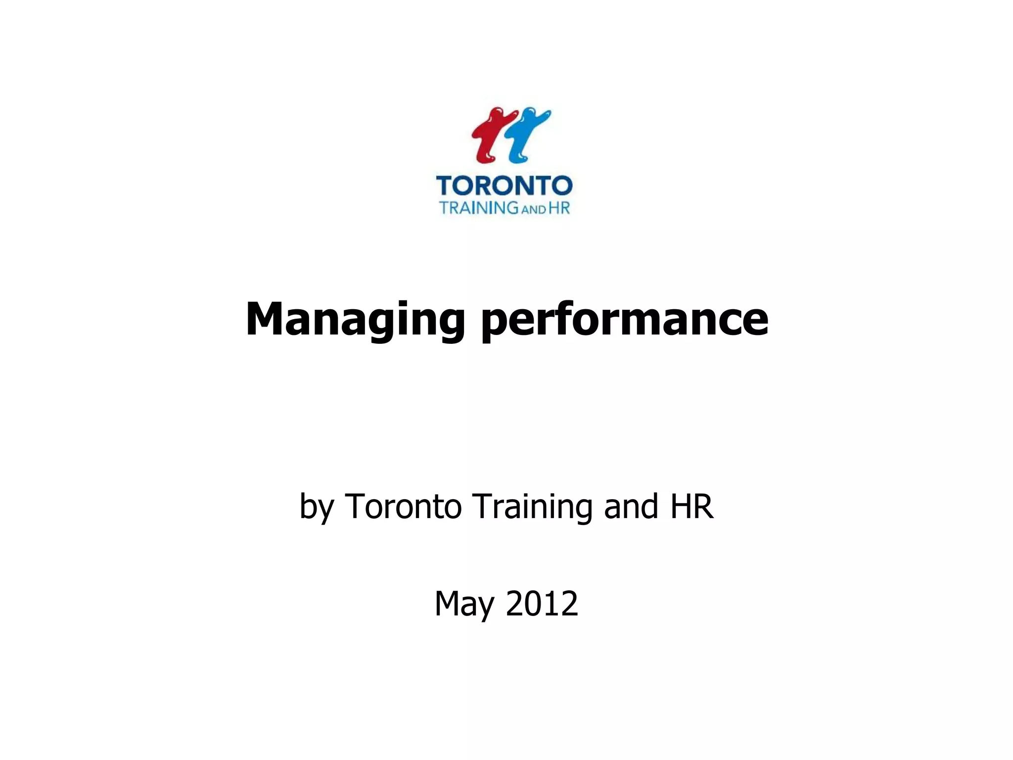 Toronto Training and HR is a human resources consultancy that provides training services and advice on performance management; the document discusses various performance management topics such as performance appraisals, engagement, feedback, and improving performance of individuals and teams. It also addresses challenges with performance management like common rating errors, problems with poor performers, and ensuring line manager commitment.
