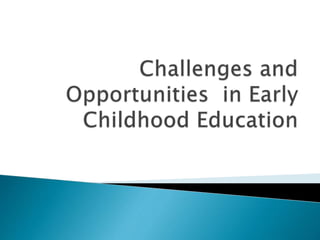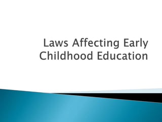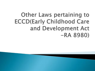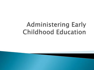 The document outlines the historical development and legal frameworks surrounding preschool education in the Philippines, highlighting key reforms such as the ECCD Act, which institutionalizes early childhood care and development. It also discusses the roles of various stakeholders in preschool operations, including administration, supervision, and teaching staff, as well as challenges faced in ensuring quality education and compliance with laws. The emphasis is placed on the importance of effective school practices and the need for a collaborative approach in providing preschool education.
