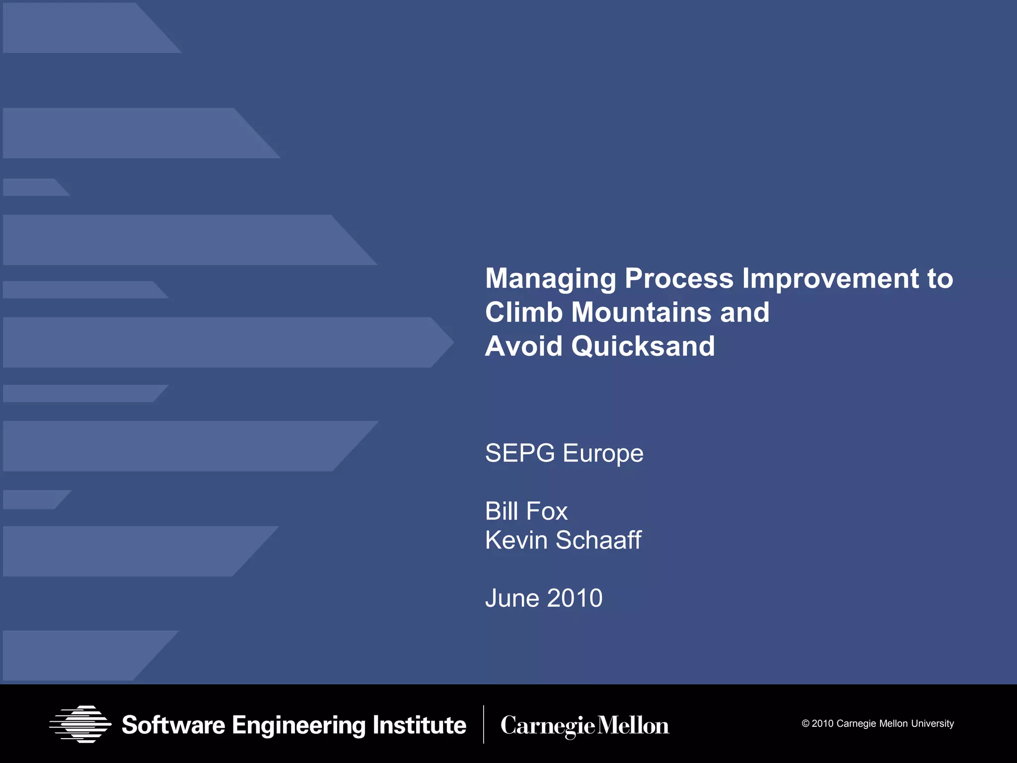 This document summarizes a presentation about managing process improvement projects to achieve success. It describes seven significant challenges faced by a small project team, including slow initial adoption of improvements, resource shortages, and lack of management support. It outlines eighteen lessons learned to help others, such as open communication, good planning, and outsider peer review. The results were achieving CMMI level 2 and 3 ahead of schedule with exemplary ratings and improved quality, expectations, relationships, and ability to change.