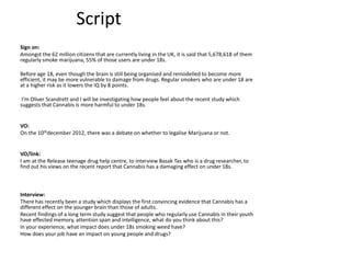 The document outlines a script for a documentary investigating the impact of cannabis use on under 18s. It discusses statistics on cannabis use in the UK and the potential risks of regular use before age 18, including lowered IQ. Interviews are planned with a drug researcher and release center to get their views on a recent study finding cannabis can have different effects on younger versus adult brains.