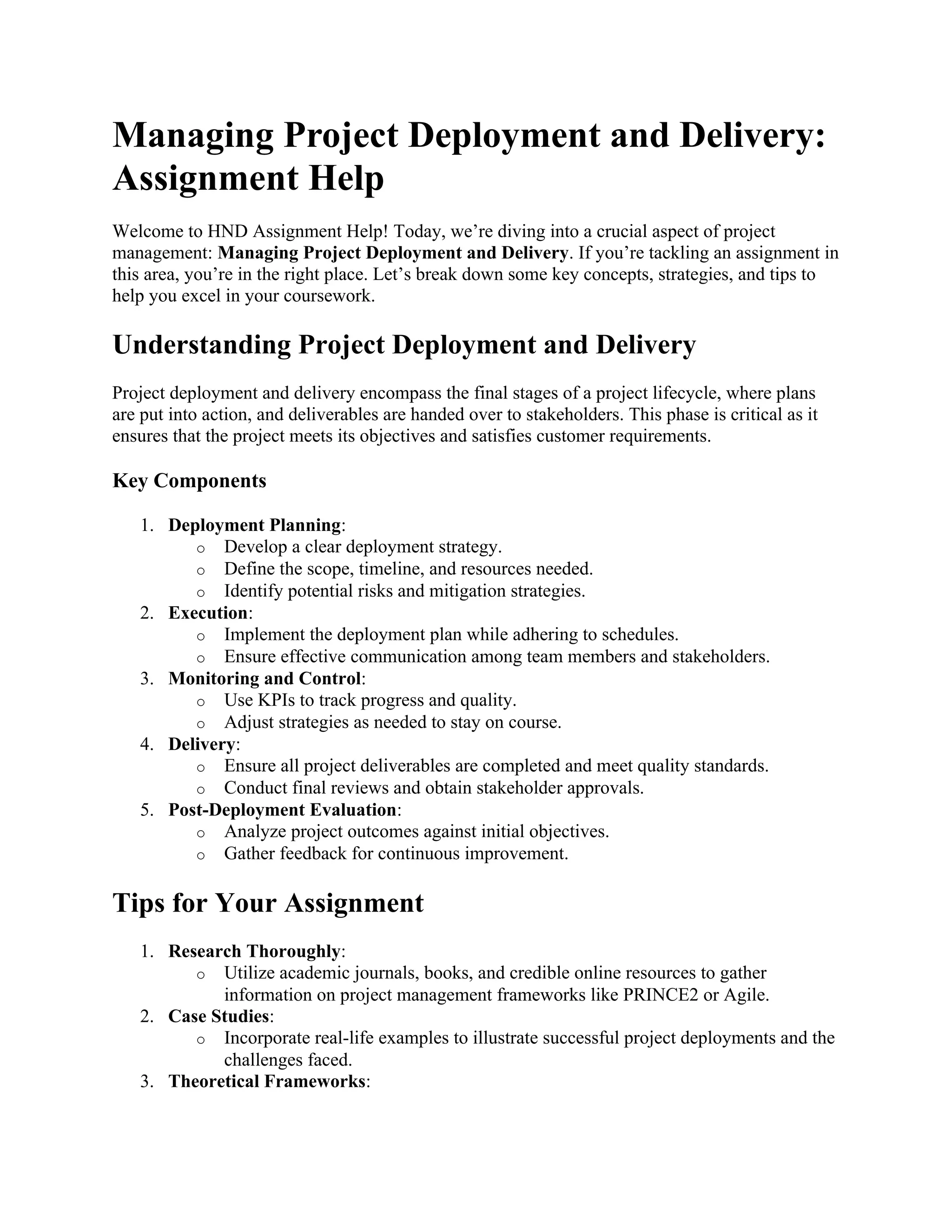 The document provides guidance on managing project deployment and delivery, highlighting its importance in ensuring project objectives are met. Key components include deployment planning, execution, monitoring, and post-deployment evaluation, alongside tips for research and presentation in assignments. HND Assignment Help offers personalized support for students tackling this complex subject.